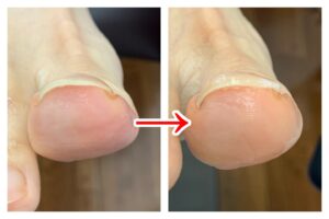 写真では少し分かりにくいかもしれませんが、施術後は曲がっていた爪がしっかりと持ち上がり、巻きが改善している状態になっています。