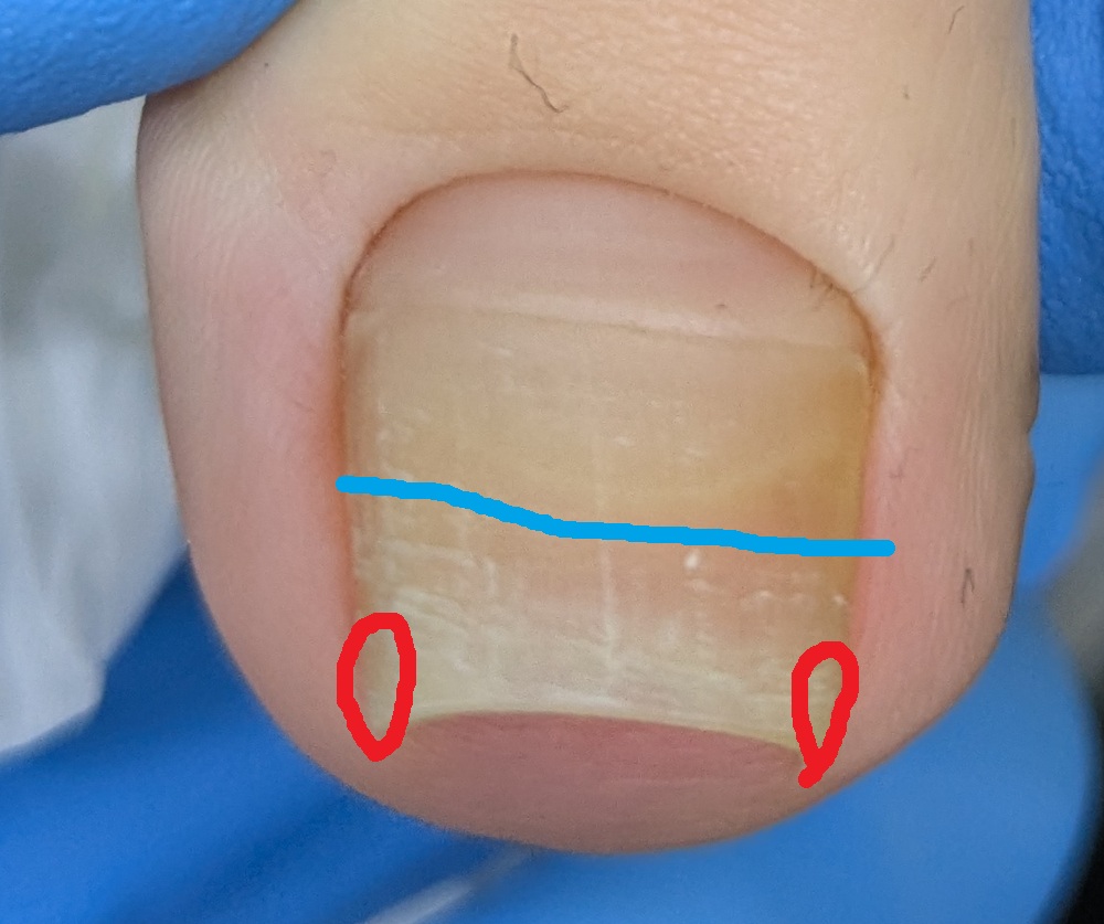 巻き爪なので赤丸部分から広げてもいいのですが、お爪の白い部分の割合が大きすぎるので危険。