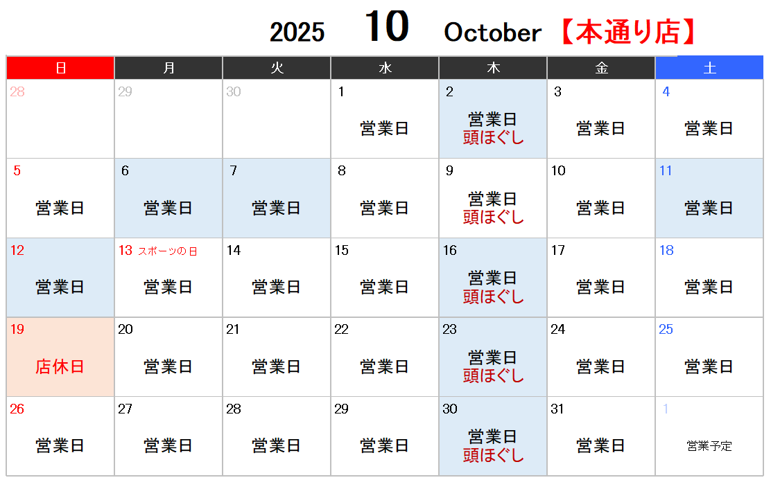 2025年10月の営業日
