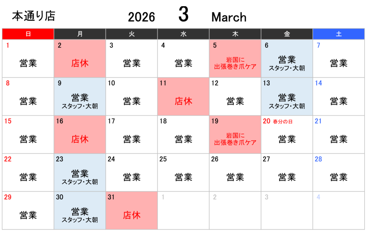 3月の営業日カレンダーです